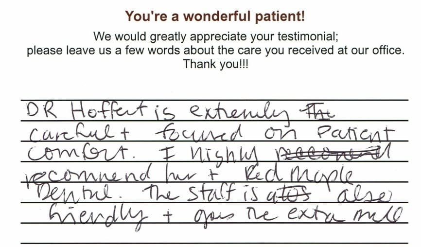 Dr. Hoffert is extremely careful & focused on patient comfort. I highly recommend her & Red Maple Dental. The staff is also friendly and goes the extra mile.