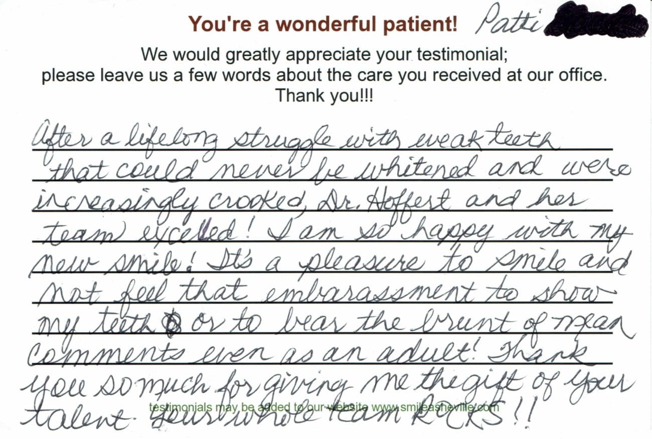 After a lifelong struggle with weak teeth that could never be whitened and were increasingly crooked, Dr. Hoffert and her team excelled! I am so happy with my new smile! It’s a pleasure to smile and not feel that embarrassment to show my teeth or to bear the brunt of mean comments even as an adult! Thank you so much for giving me the gift of your talent. Your whole team ROCKS!!!