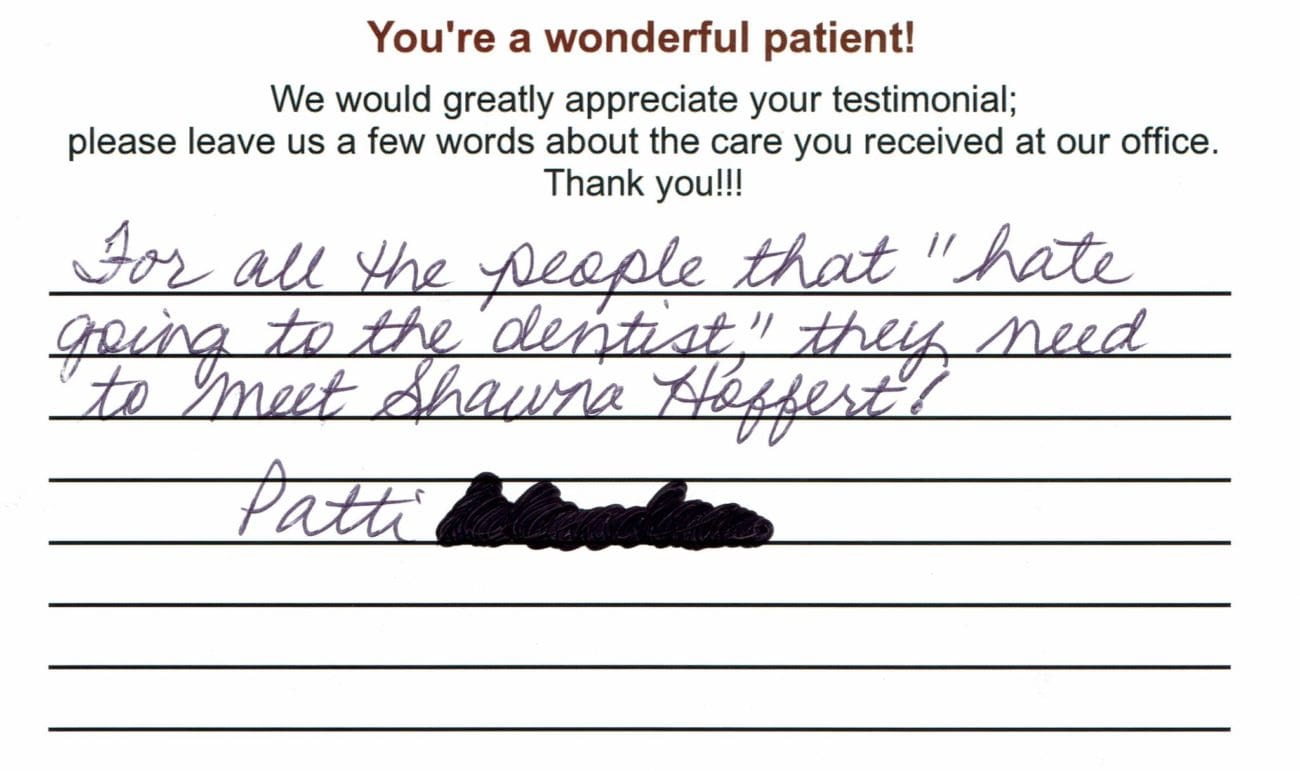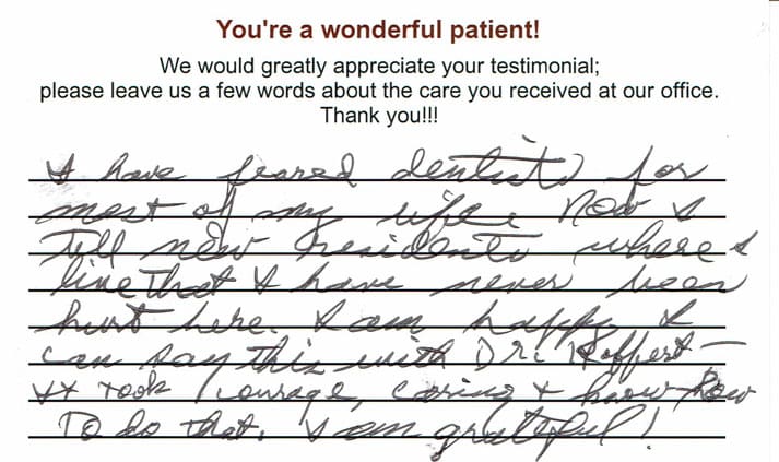 I have feared dentists for most of my life. Now I tell new residents where I live that I have never been hurt here. I am happy I can say this with Dr. Hoffert – It took courage, caring, and know how to do that. I am grateful!