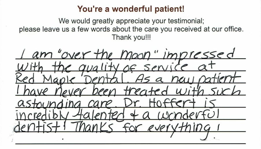 I am “over the moon” impressed with the quality of service at Red Maple Dental. As a new patient I have never been treated with such astounding care. Dr. Hoffert is incredibly talented & a wonderful dentist! Thanks for everything