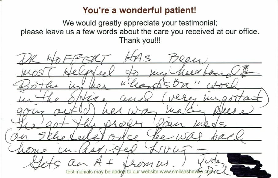 Dr. Hoffert has been most helpful to my husband. Both in her “hands-on” work in the office and (very important) going out of her way making sure he got the proper pain meds on schedule once he was back home in Assisted Living. Gets an A+ from us.