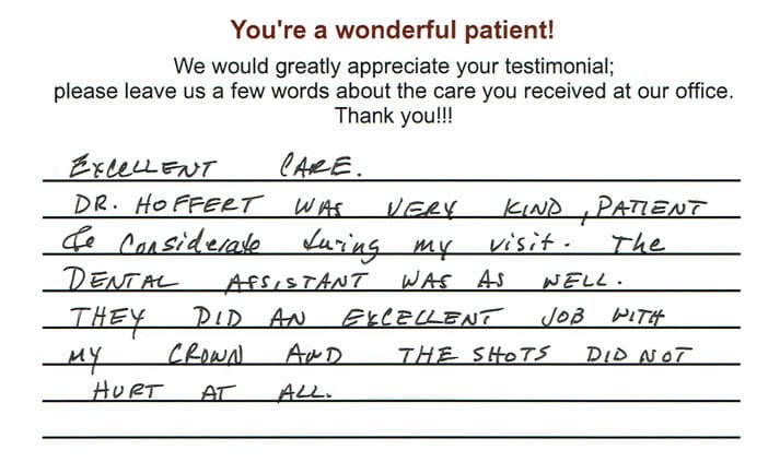 Excellent Care! Dr. Hoffert was very kind, patient, and considerate during my visit. The Dental Assistant was as well. They did an excellent job with my crown and the shots did not hurt at all.